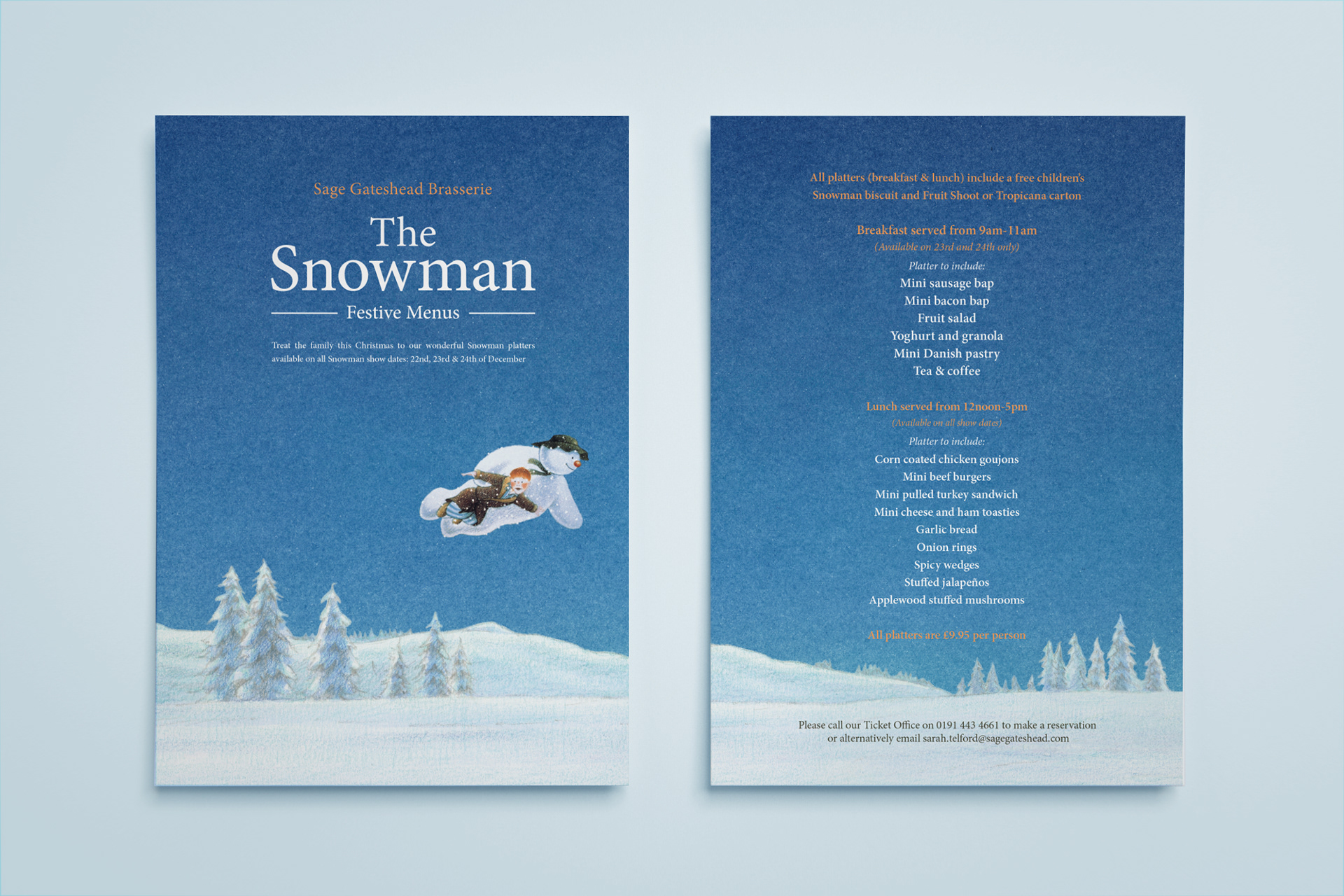 The venue would occasionally host themed events at their restaurant Sage Gateshead Brasserie. I created food menus for two of these events - The Snowman and Monstersaurus.